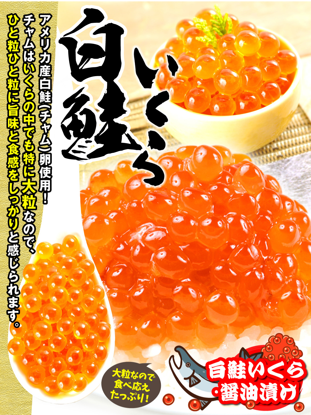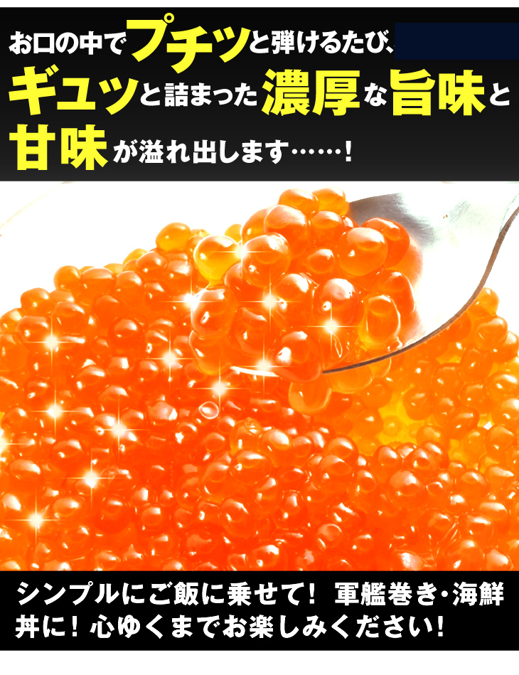 ●商品情報:雄大なアメリカの海で育まれた新鮮な白鮭(チャム)の鮭卵を使用した、食べ応え抜群の醤油漬けです。白鮭の卵は鮭の中でも特に粒が大きく、ひと粒ひと粒に旨味と食感をしっかりと感じられます。