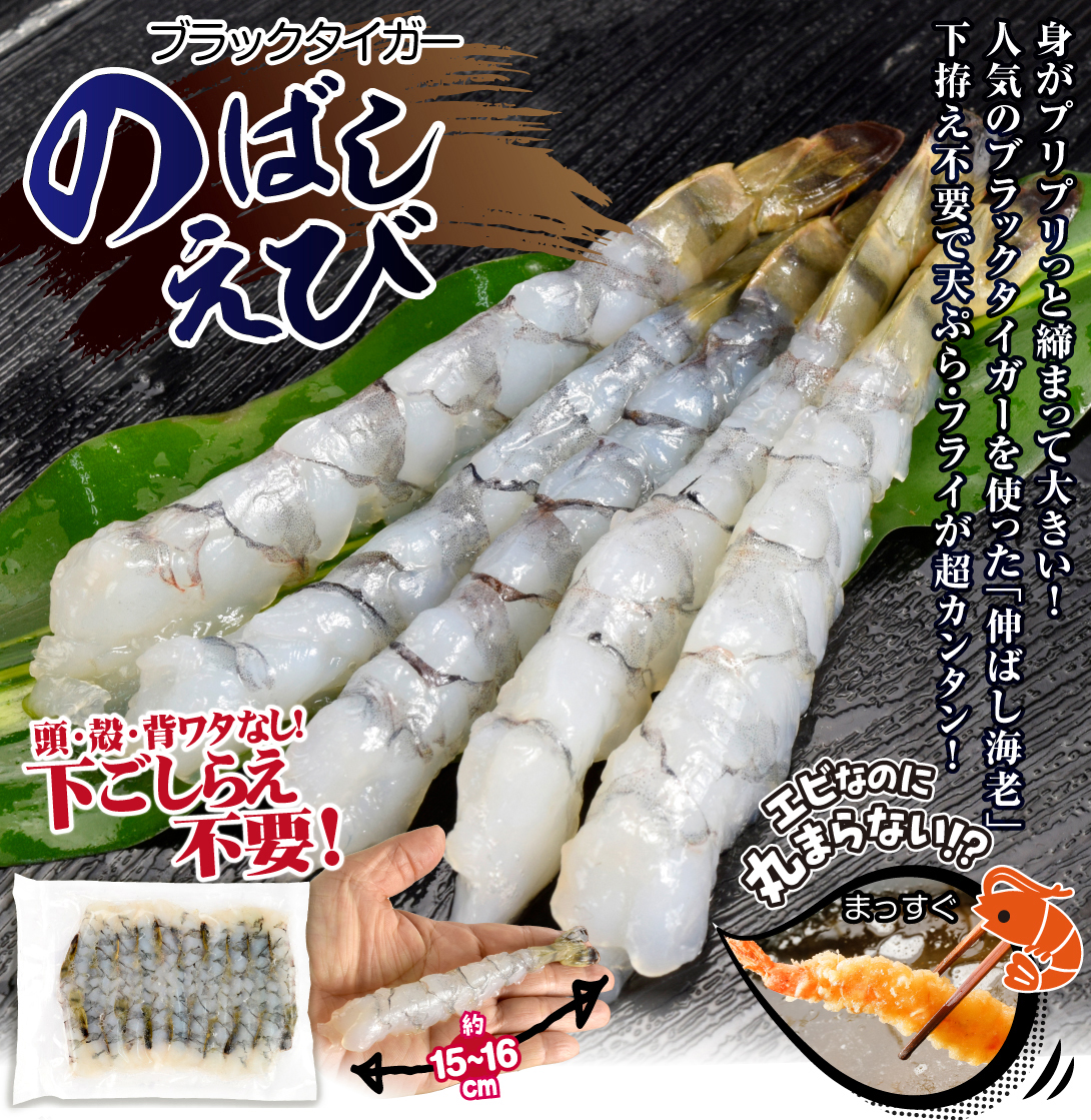 ●商品情報:身がプリプリっと締まって大きい!人気のブラックタイガー海老を、殻・頭・ワタを取り、腹に切れ目を入れのばした「伸ばしえび」です。下拵え不要で身が丸くならないので、海老フライやえび天が簡単にまっすぐ揚って、お店のようにきれいに仕上がります。