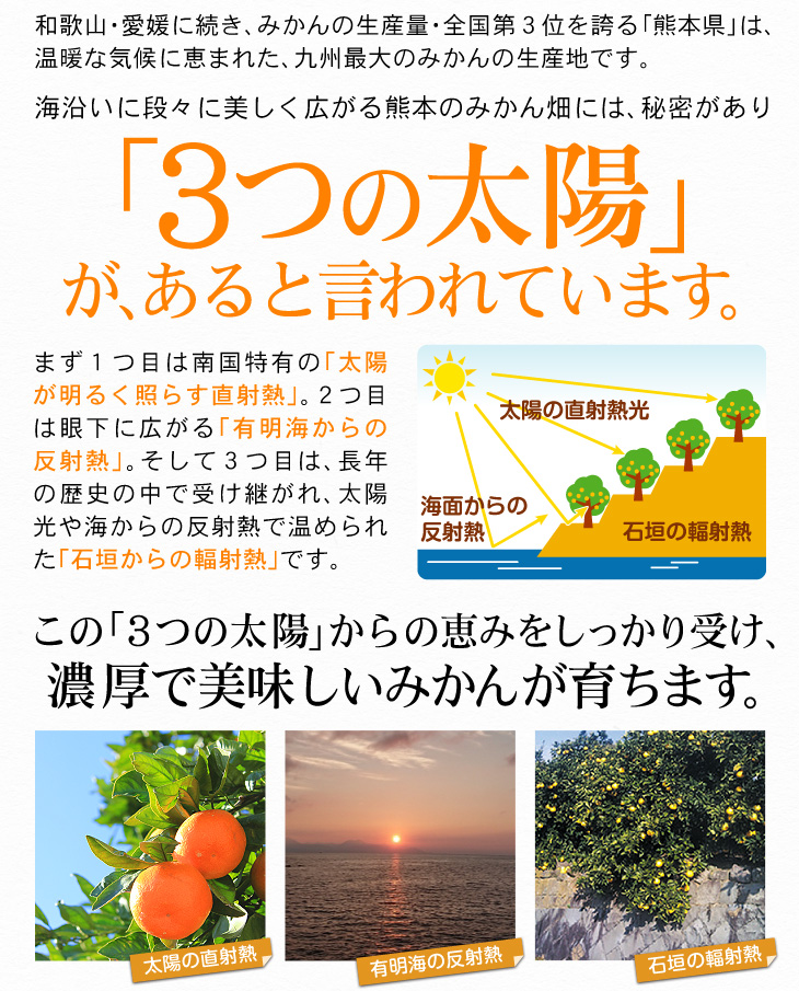 ●商品情報:肥後国(ひごのくに)・熊本の有明海沿岸の温暖な風土と太陽の恵みに育まれた濃厚温州みかんです。