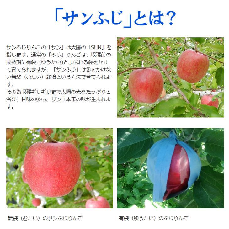 サンふじりんごの「サン」は太陽の「SUN」を指します。通常の「ふじ」りんごは、収穫前の成熟期に有袋(ゆうたい)とよばれる袋をかけて育てられますが、「サンふじ」は袋をかけない無袋(むたい)栽培という方法で育てられます。 |