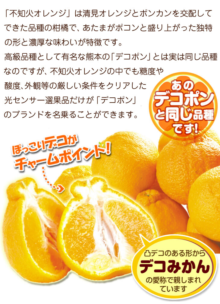 ●商品情報:清見とポンカンの血をひく『不知火(しらぬい)オレンジ』は、頭がポコンと盛り上がった独特の形と、コクと甘みたっぷりの濃厚な味わいが特徴の高級柑橘です。手で簡単にむいて食べることができるのも人気!
