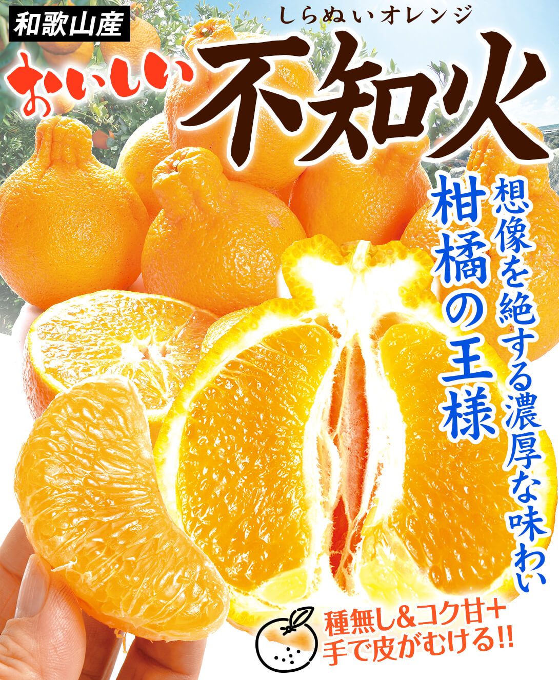 ●商品情報:清見とポンカンの血をひく『不知火(しらぬい)オレンジ』は、頭がポコンと盛り上がった独特の形と、コクと甘みたっぷりの濃厚な味わいが特徴の高級柑橘です。手で簡単にむいて食べることができるのも人気!