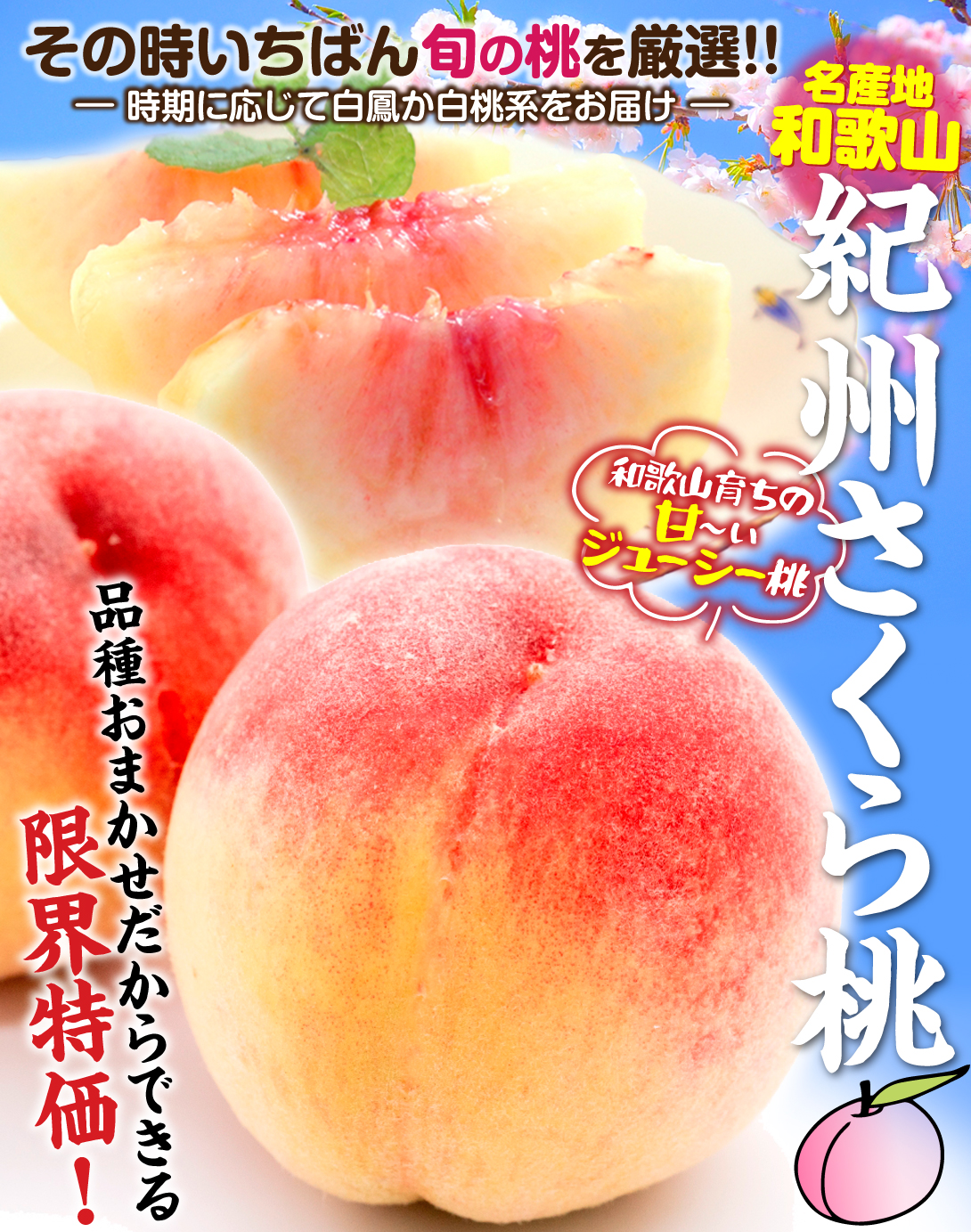 ●商品情報:西日本で一番の桃収穫量を誇る、歴史ある桃の名産地・和歌山で育った、トロ~リとろける美味しい桃。果汁たっぷりの柔らかな白鳳または白桃系の桃を、その時最旬の品種から1品種選んでお届けいたします。