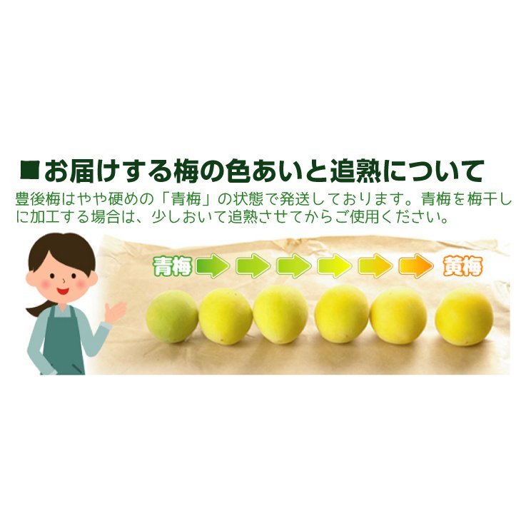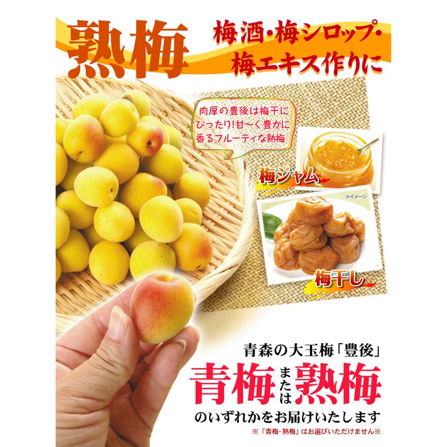 ≪生梅について≫※梅から放出される水分により、密閉状態ではカビが発生しやすくなります。到着後はすぐに開封してください。※生梅をそのまま食べると健康に害を及ぼす恐れがありますので、漬ける・干す・加熱する等、必ず加工してからお召し上がりください。※輸送中の水分の放出により、お届け時の重量が記載の量と異なる場合があります。ご了承ください。