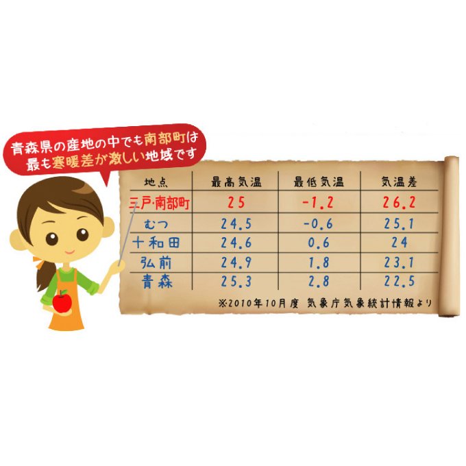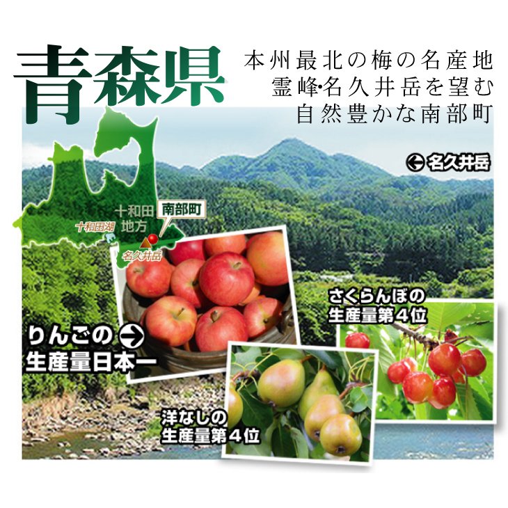 八甲田山や十和田湖を擁し、秋田・岩手に跨る奥羽山脈が中央を縦走する本州最北の地・青森県。山脈を挟んだ県東部に広がる十和田地方の 南に位置し、名久井岳を望む自然豊かな町である南部町は、肥沃な土壌と県下髄一とも言われる厳しい昼夜の寒暖差により、糖度が高く旨みの深いおいしい果実 が育つ東北有数の果実の町として知られています。 |