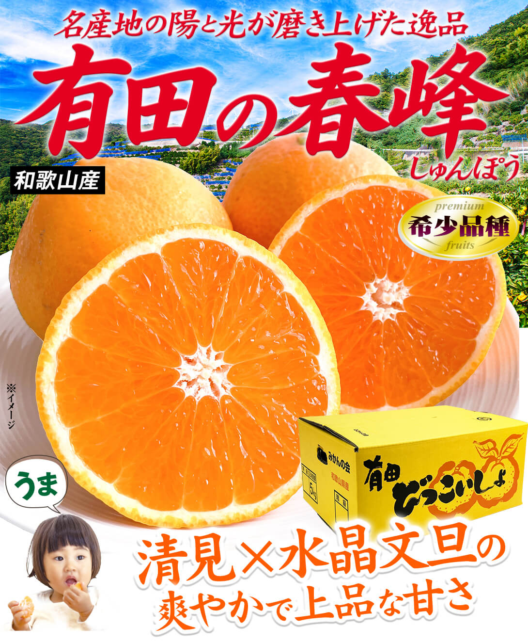 ●商品情報:和歌山・有田の温暖な気候で育った、春限定の柑橘「春峰(しゅんぽう)」。清見と水晶文旦を掛け合わせて誕生した品種で、爽やかな甘さと上品な香り、そしてみずみずしい果汁が特徴です。ひと口頬張れば、春らしいやさしい甘みが口いっぱいに広がり、後味はすっきり。酸味とのバランスが良く、何個でも食べたくなる軽やかな美味しさです。果肉はやわらかくジューシーで、皮も比較的むきやすいため、手軽にお召し上がりいただけます。