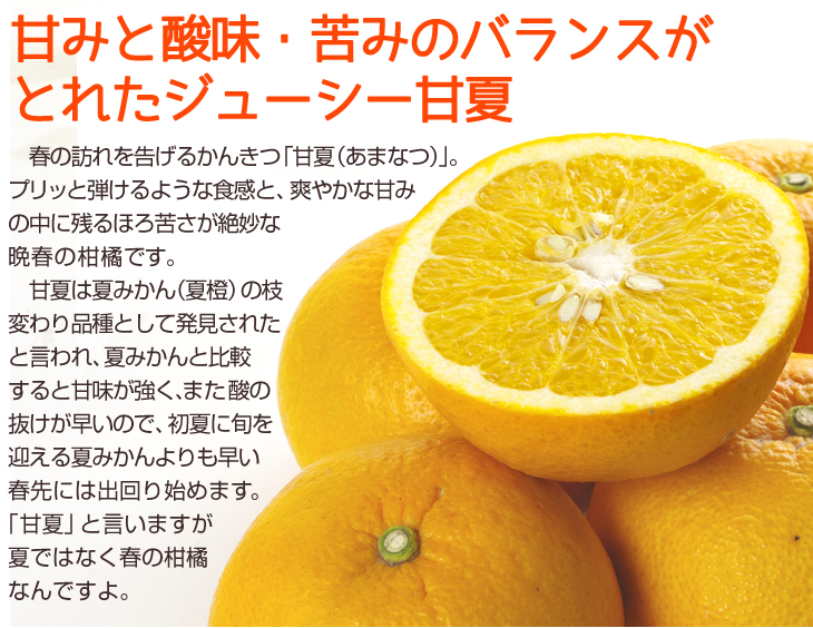 ●商品情報:温暖な気候を活かし、春先までじっくり樹上完熟させた木熟甘夏。プリっと果肉は、まろやかな酸味と甘味が絶妙で、ほろ苦く大人の味わい。