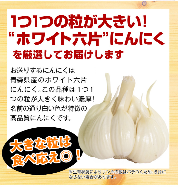 ●商品情報:にんにく生産量日本一の青森から、品質自慢の逸品・青森ホワイト六片種をお届け!本州最北の厳しい寒暖差の中で育てられたにんにくは、味・香りが良く、料理の風味づけに最適です。