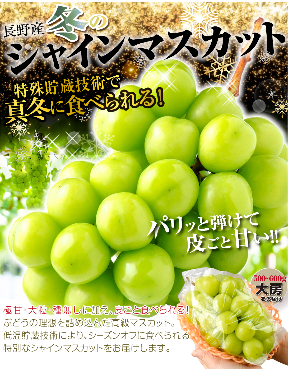 あの大人気ブドウを冬時期に味わえる、スペシャル企画。旬に貯蔵した果実を、特殊低温貯蔵技術でシーズンオフの真冬にお届けします。