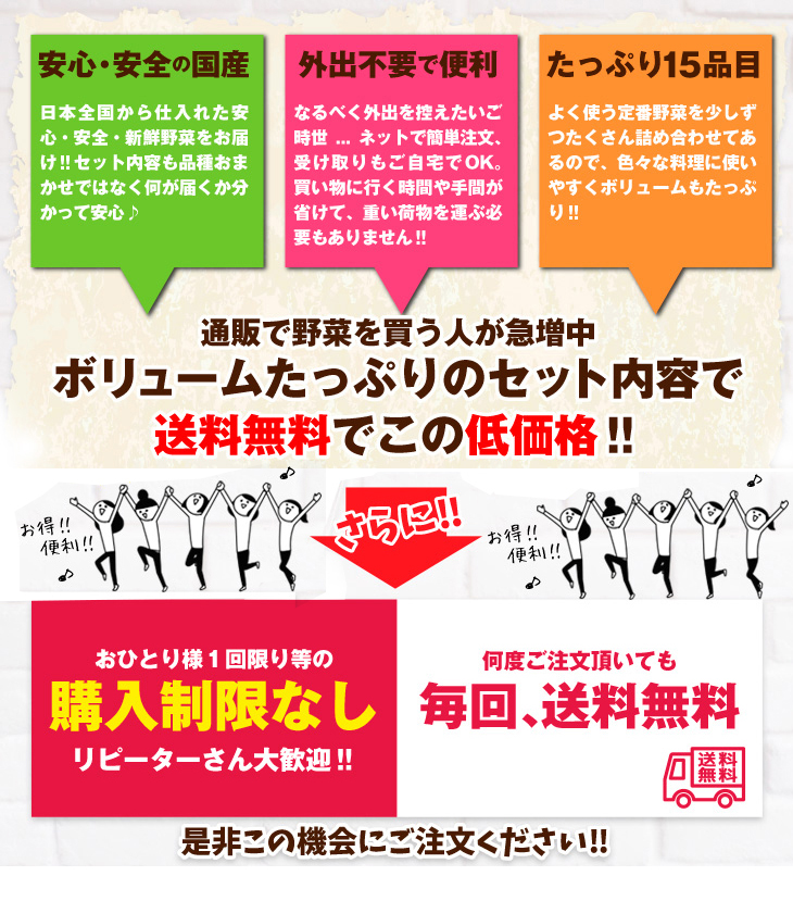 ●備考:【産地・品目・数量指定不可】※ご家庭用・無選別品としてご用意いたします。ギフト用ではございませんので、多少の傷・変形・外観のバラツキ等はご了承ください。※産地やお届けの量・状態・品種は、時期や入荷状況により異なります。※天候や生育・入荷の状況等により、野菜セットの内容が一部変更・フルーツが入る場合がございます。※商品の品目変更や数量のご指定等はお受けしておりません。予めご了承ください。