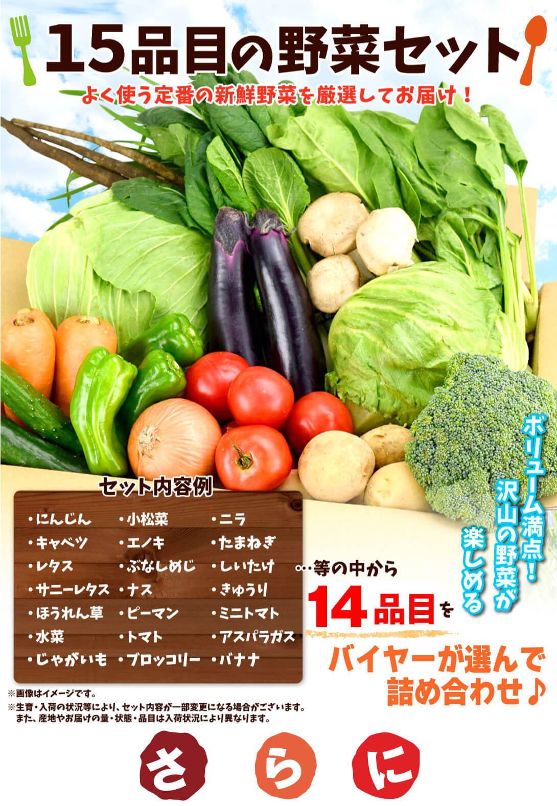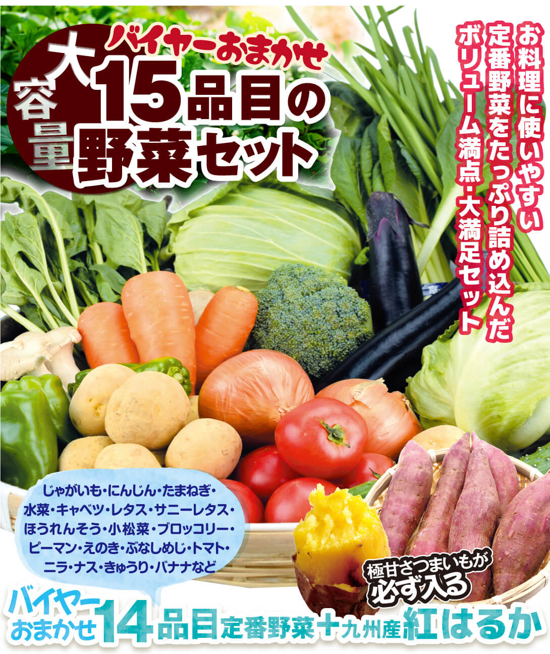 ●商品情報:毎日のお料理に使いやすい定番野菜が、たっぷり15品目の大容量でお手頃価格!内容は目利きバイヤーにおまかせですが、人気の極甘いも「紅はるか」が1品目として必ず入ります。