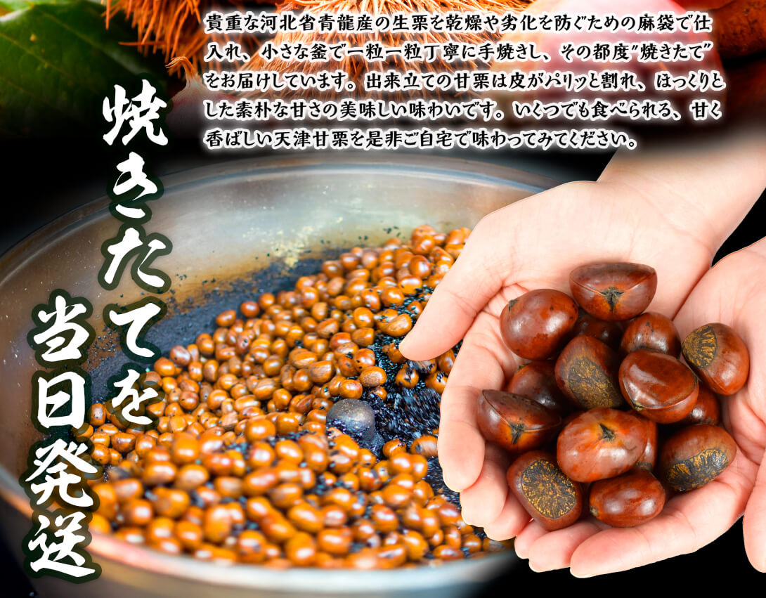 ●商品情報:ホクホク甘い天津甘栗を「焼いたその日」に発送!鮮度抜群&無添加!鮮度が命の天津甘栗は、専用の熱した石を使い、昔ながらの製法で一粒一粒焼き上げた、日本人に馴染みの定番商品です。出来立ての美味しさを味わっていただくために、出荷当日に焼き上げた商品を鮮度そのままに発送します。