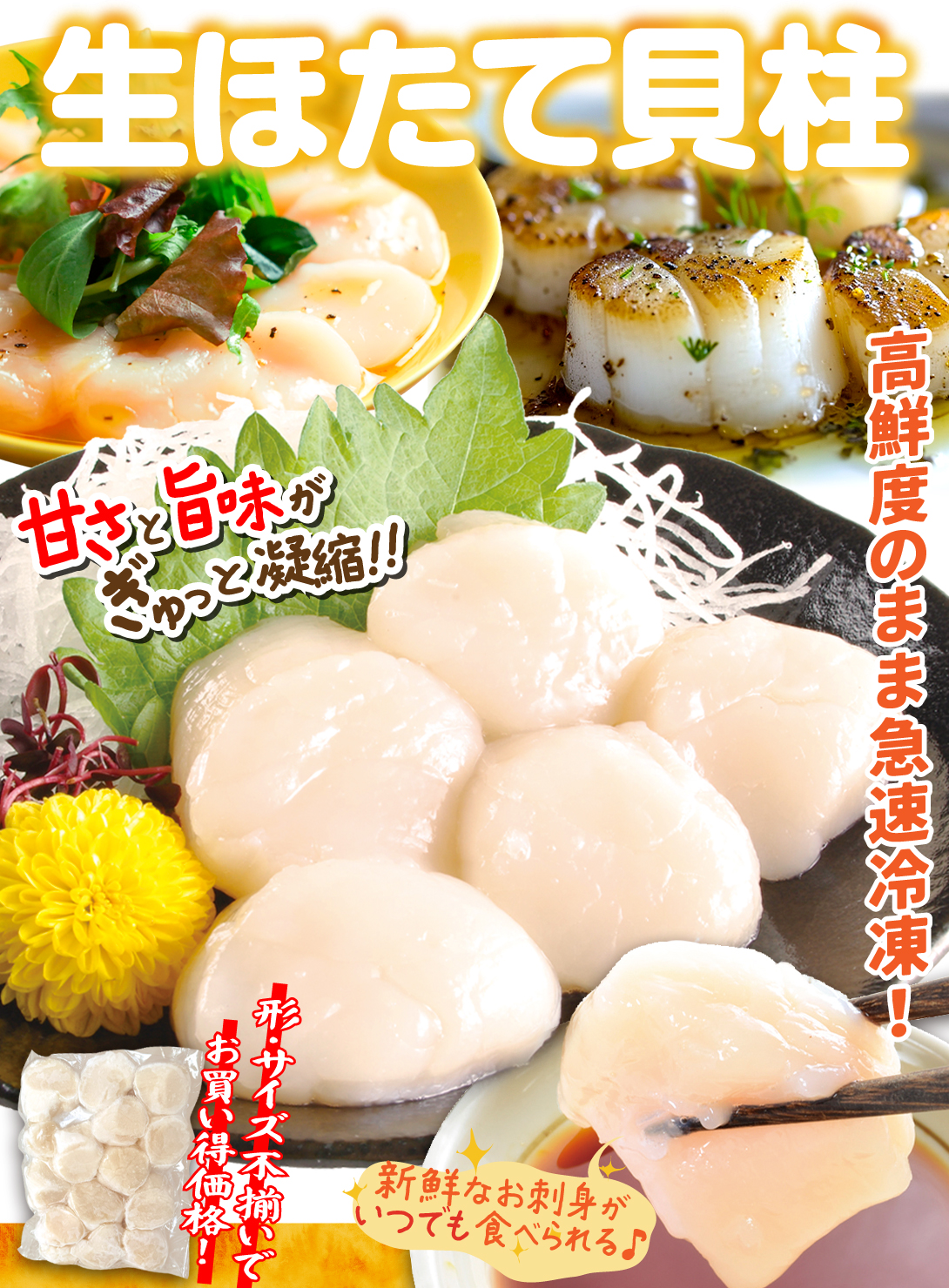 ●商品情報:肉厚で甘い生食用ほたて!むっちり弾力があり肉厚な貝柱を、高鮮度のままバラ凍結。「甘さ」と「旨味」がぎゅっと凝縮!