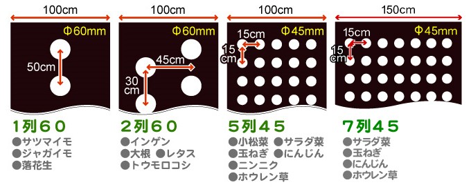 ●サイズ:幅:0.95m、長さ:10m、株間:50cm、穴径:60mm 1列