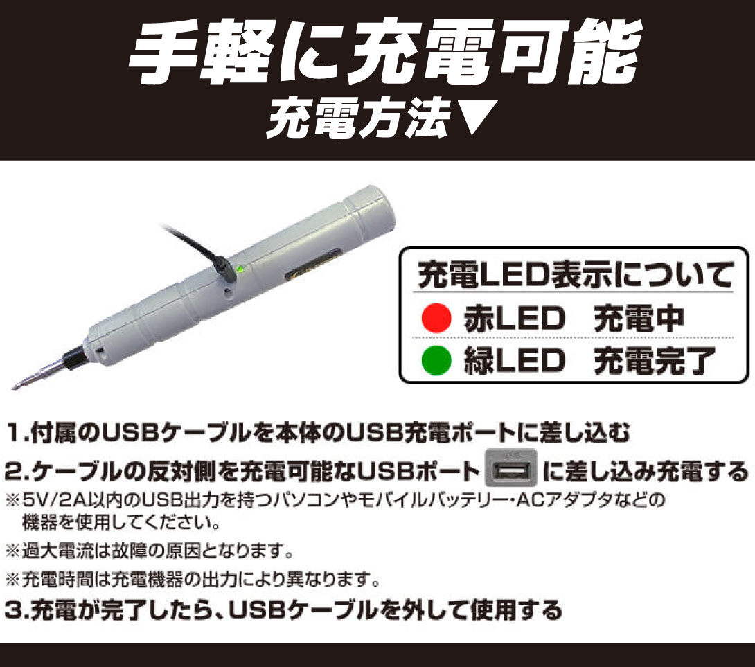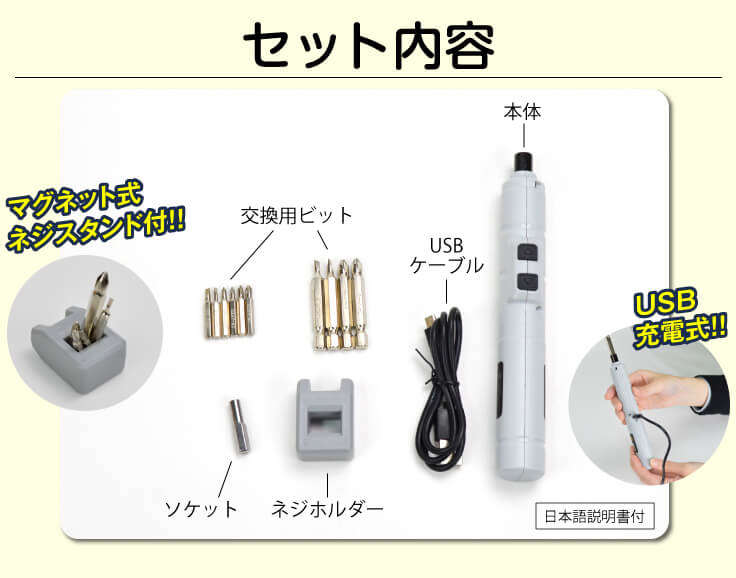 ●セット内容:本体、交換用ビット10種類、ソケット1個、USBケーブル、ネジホルダー