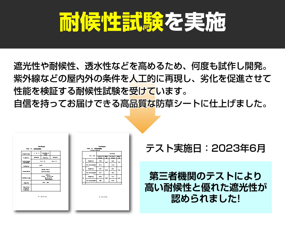 高品質な防草シートをお届けするため、耐候性試験を実施。 長期間ご使用いただけるので何度も張り替えるのが面倒な方にオススメ