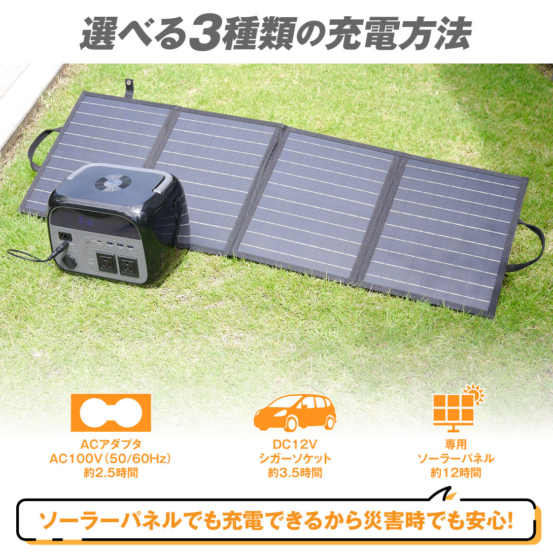 家庭用コンセントからの充電は約2.5時間、車載DC12Vシガーソケットからの充電は約3.5時間で完了!ソーラーパネルを使うと電気を使えない時でも充電でき、災害時などにピッタリ。季節や天候にもよりますが約12時間で満充電になります。