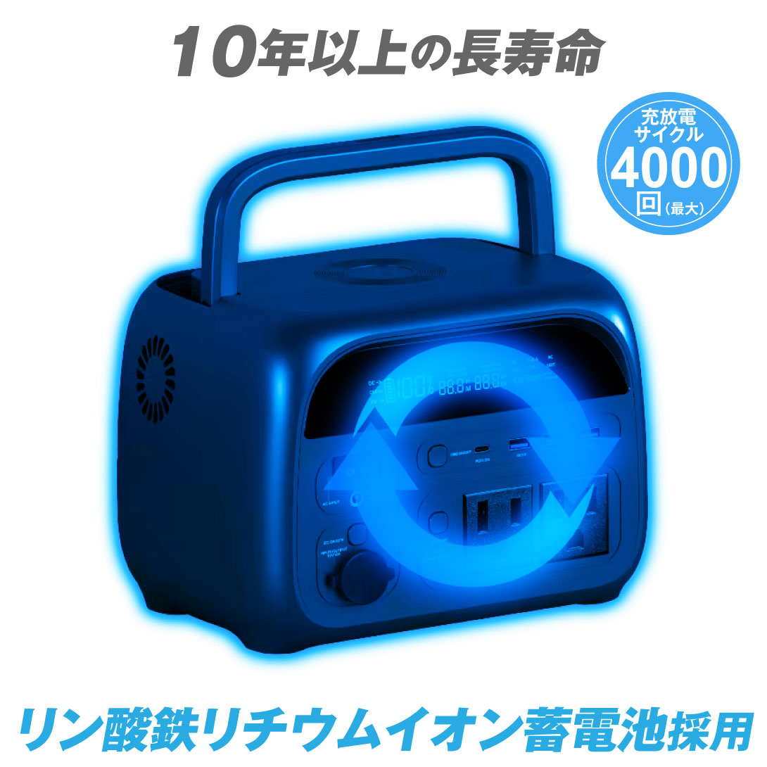 安全性が高く、寿命の長い「リン酸鉄リチウムイオン」を採用。充放電サイクルは最大4000回で、1日1回充電しても10年は使えます。