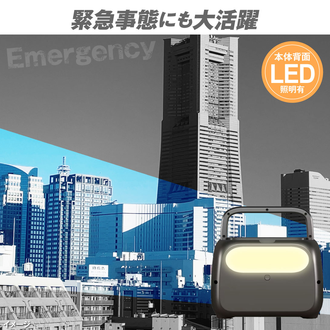本体背面にはLED照明がついています。弱モード・強モード・SOSモード・フラッシュモードで点灯。災害時や停電時の非常電源としてはもちろん、照明代わりにもなります。