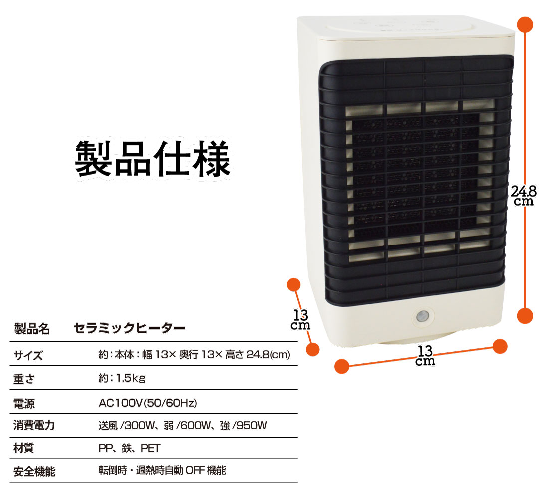 ●切替モード 2段階(弱モード、強モード、送風)、タイマー設定、首振り設定、人感センサー