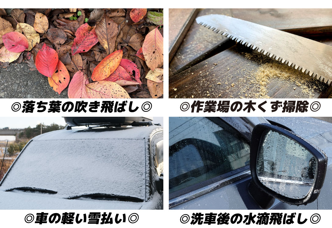 落ち葉の吹き集め、洗車後の乾燥、ホコリ飛ばし、木くず掃除などに!!