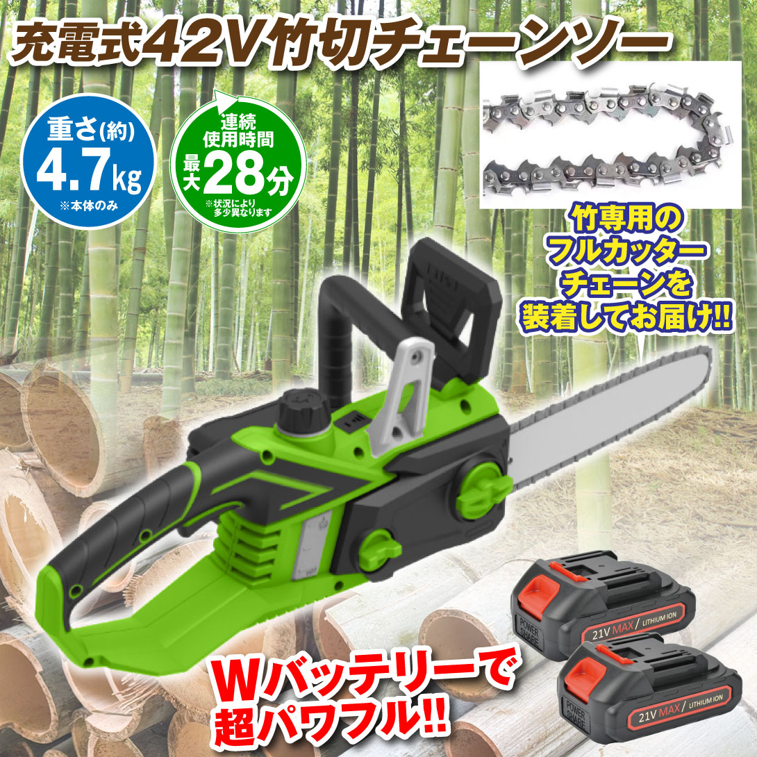 チェーンソー 充電式 コードレス 12インチ マキタ バッテリー 互換 竹切り専用ソーチェーン 家庭用 バッテリー2個 充電器2個付属 充電式42V竹切チェーンソー