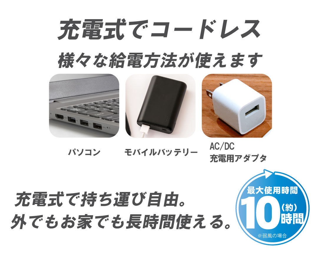 ●約5~6時間の充電で3~10時間使用可能!!※風量により異なります。
