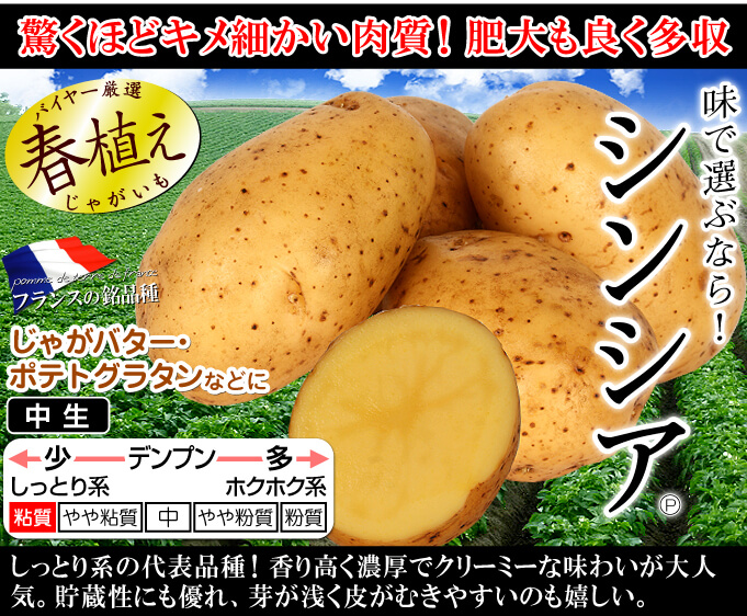 フランスの大手種苗会社「ジェルミコパ社」が作出した、舌触りまろやかな粘質系のじゃがいも。肉質が非常になめらかで、クリーミーな味わいが大人気!!特にバターやクリームとの相性が抜群なので、ジャガバターやポテトグラタンにすると絶品です。肥大良く多収で、貯蔵性にも優れており、芽が浅く皮も剥きやすい優秀品種!!