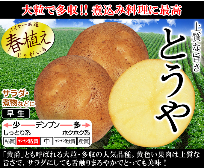 ●商品情報:「黄爵」とも呼ばれる大粒・多収の人気品種。黄色い果肉は上質な旨さで、サラダにすると舌触りなめらかでと~っても美味。煮物に最適です。
