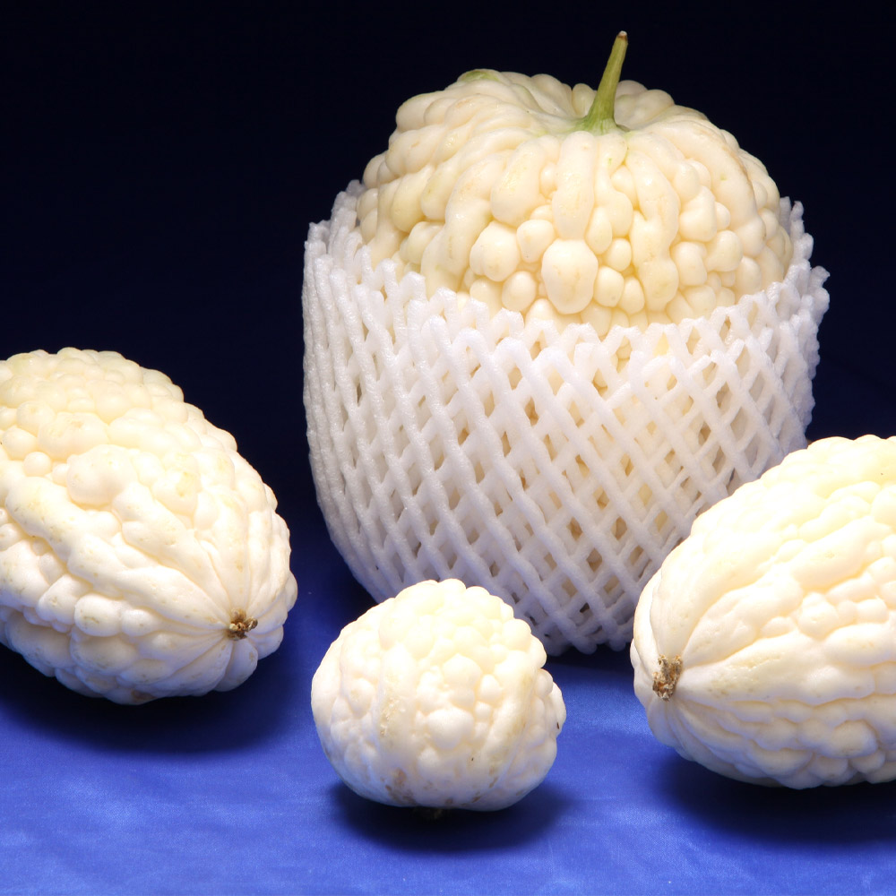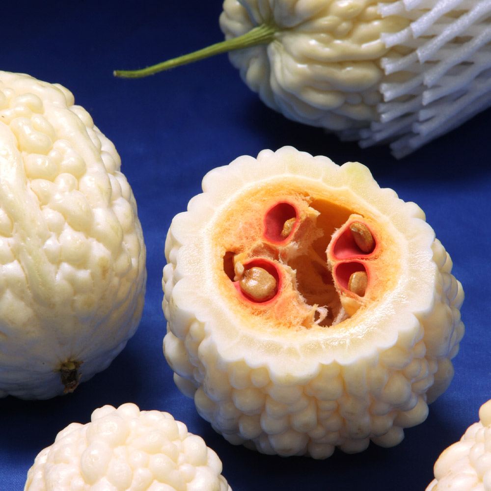 果肉が極めて厚く、果重最大1000gにもなる白レイシ系選抜種です。生育初期はミカンのような球形(50~100g)で成長が進むにつれ、りんご型(200g~300g)や提灯型(300~900g)となります。