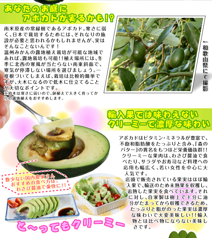 【アボカド】クスノキ科。南米原産の常緑樹ですが、温州みかんの露地植えができる地域ならアボカドの露地植えも可能! 北風が当たらない南向きに植えるのが重要です。ビタミン・ミネラルが豊富で、不飽和脂肪酸をたっぷりと含み、 「森のバター」の異名をもつほど栄養価抜群!! 販売されている輸入果は未熟果で収穫します。 それに比べ、自家製は樹上で十分に油分がたっぷりまわってから収穫できるから、たっぷりと脂がのった果実は 濃厚な味わいで旨い!! 輸入物とは比べ物になりません。和名:鰐梨(ワニナシ)