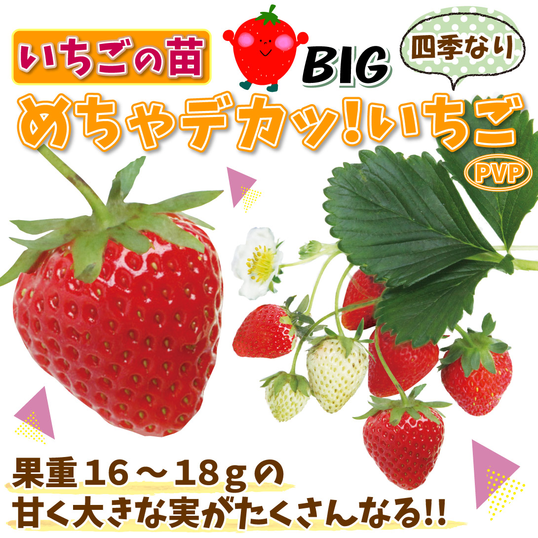 めちゃデカッ!いちご:果重16~18gの甘く大きな実がたくさんなる四季なり品種。春から秋まで収穫期間が長いのもうれしい!!プランター栽培できるので、ぜひご家庭でご賞味ください。