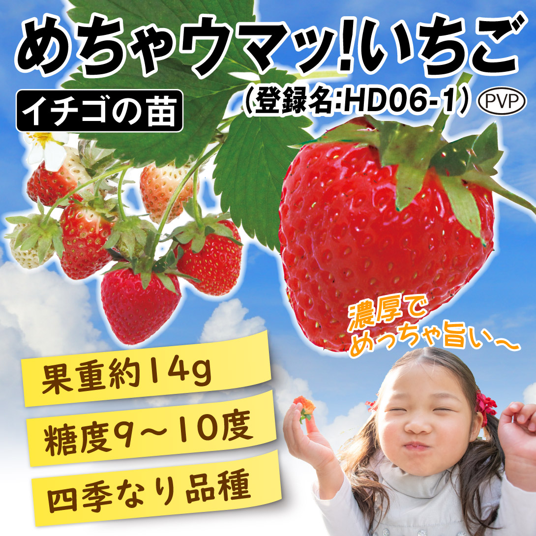 めちゃウマッ!いちご:果重約14g、糖度9~10度の濃厚な食味のイチゴ。春だけじゃなく秋まで次々と実がつき多収。収穫期間が長い食味抜群の四季成り品種。家庭菜園に最適です。
