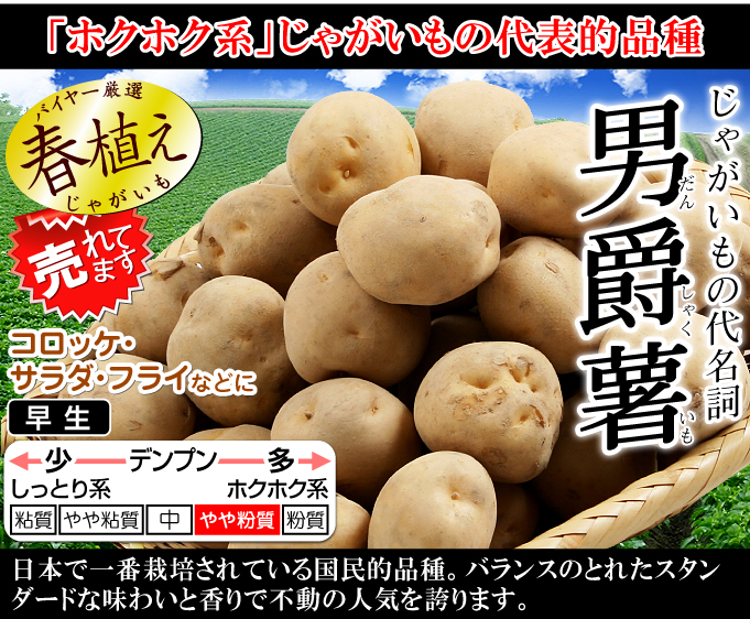 ホクホク系じゃがいもの代表格!コロッケやポテトサラダ、フライなどに不動の人気を誇ります。