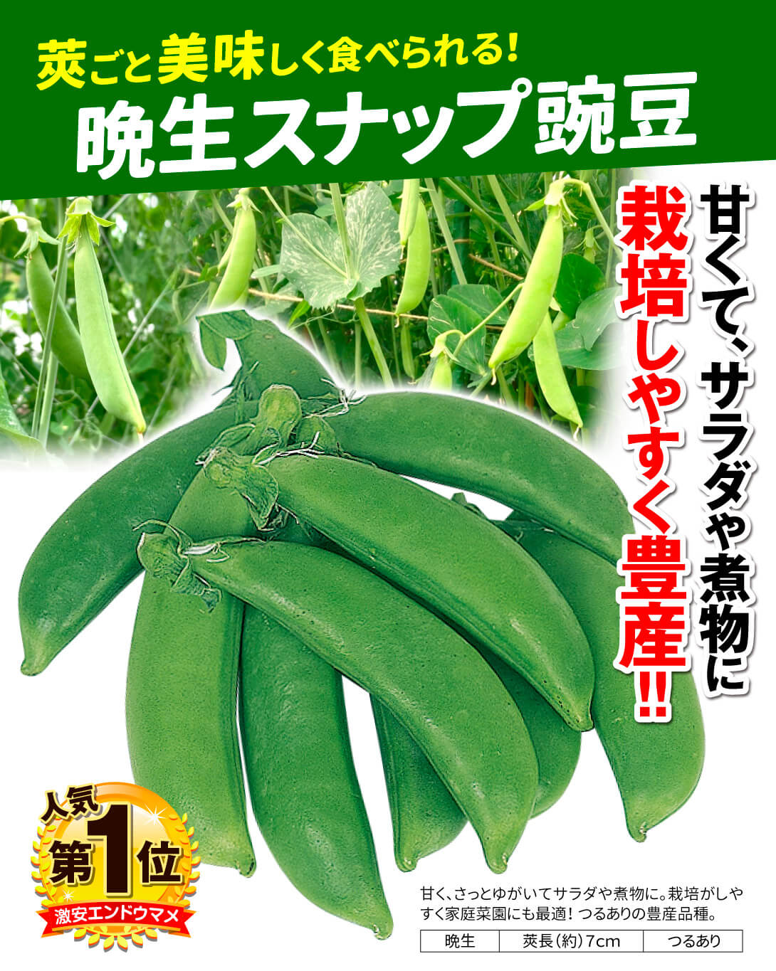 莢ごと美味しい豌豆。甘味たっぷりで、ゆがいてサラダや煮物にオススメ。栽培容易な豊産種で家庭菜園に最適。