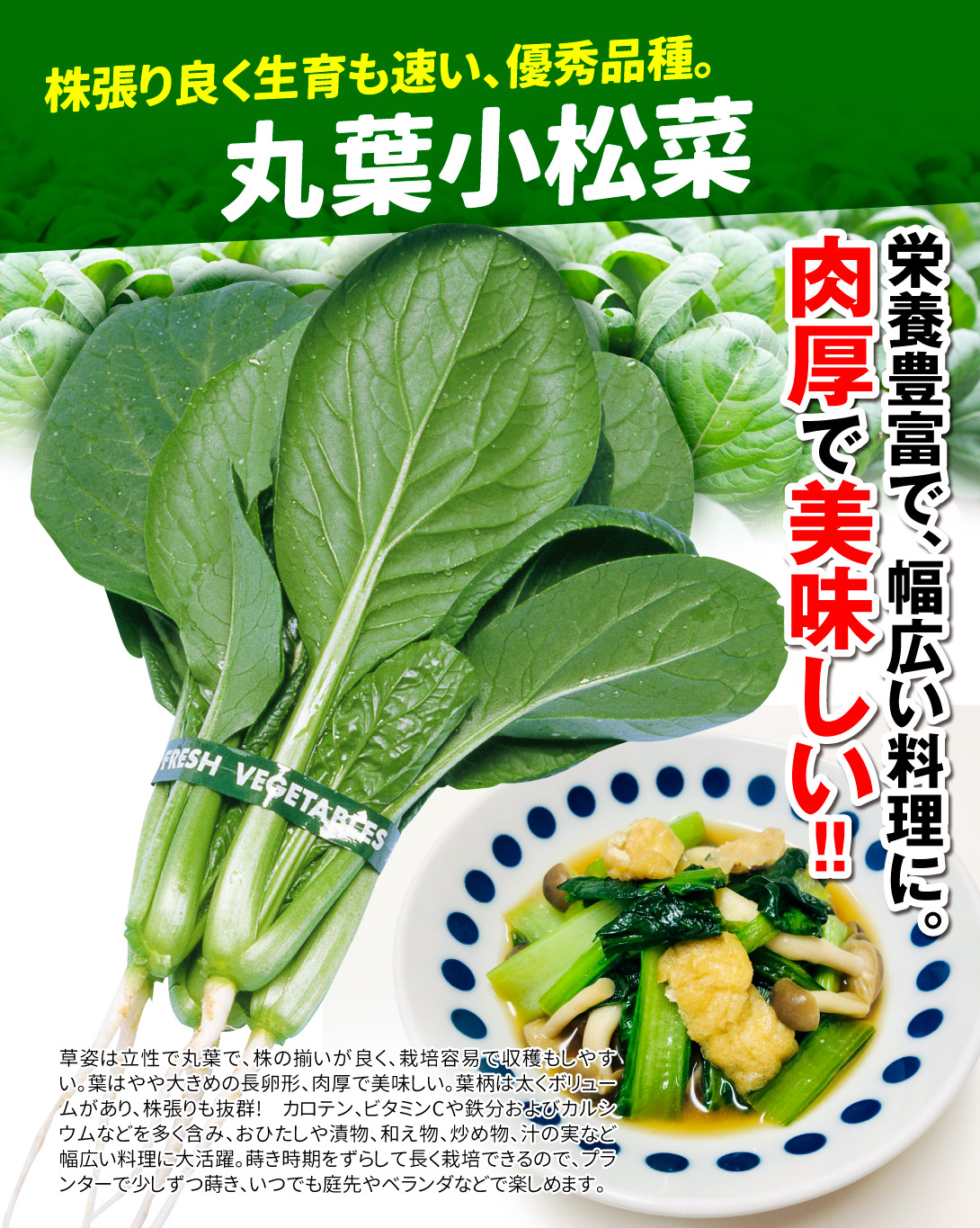 草姿は立性で丸葉で、株の揃いが良く、栽培容易で収穫もしやすい。葉はやや大きめの長卵形、肉厚で美味しい。葉柄は太くボリュームがあり、株張りも抜群! カロテン、ビタミンCや鉄分およびカルシウムなどを多く含み、おひたしや漬物、和え物、炒め物、汁の実など幅広い料理に大活躍。蒔き時期をずらして長く栽培できるので、プランターで少しずつ蒔き、いつでも庭先やベランダなどで楽しめます。 |