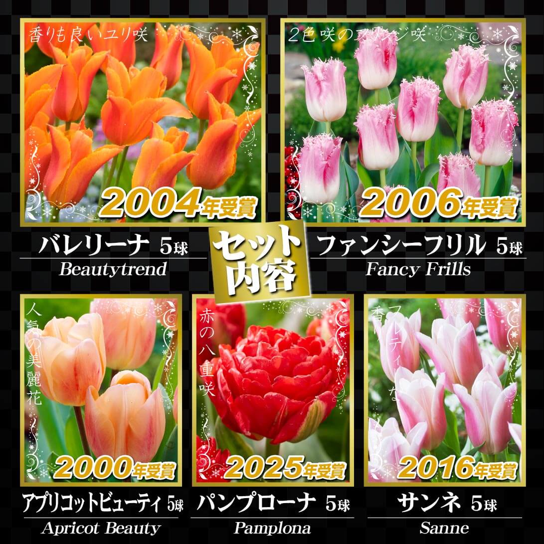 フラワーバルブオブザイヤーを受賞したチューリップの銘花を集めたセット。ユリ科。