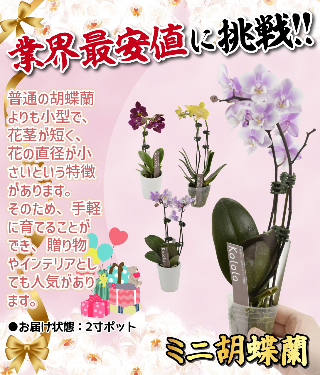 ミニ胡蝶蘭は、普通の胡蝶蘭よりも小型で、花茎が短く、花の直径が小さいという特徴があります。