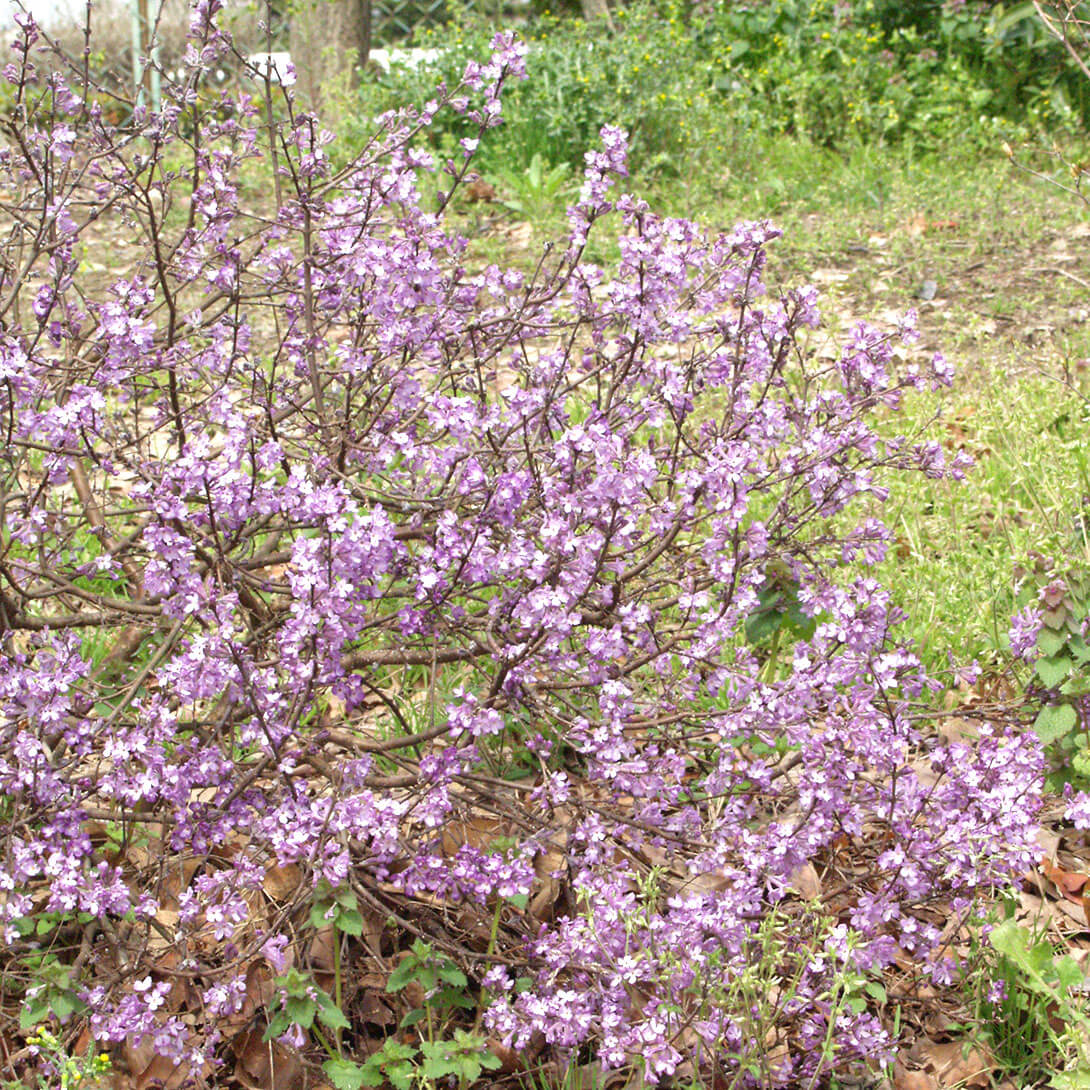 長寿桜は、まだ葉のない時期から、淡く香りのある薄紫色の小花を咲かせます。桜ではなく沈丁花の仲間で、別名フジモドキ。長期間開花!