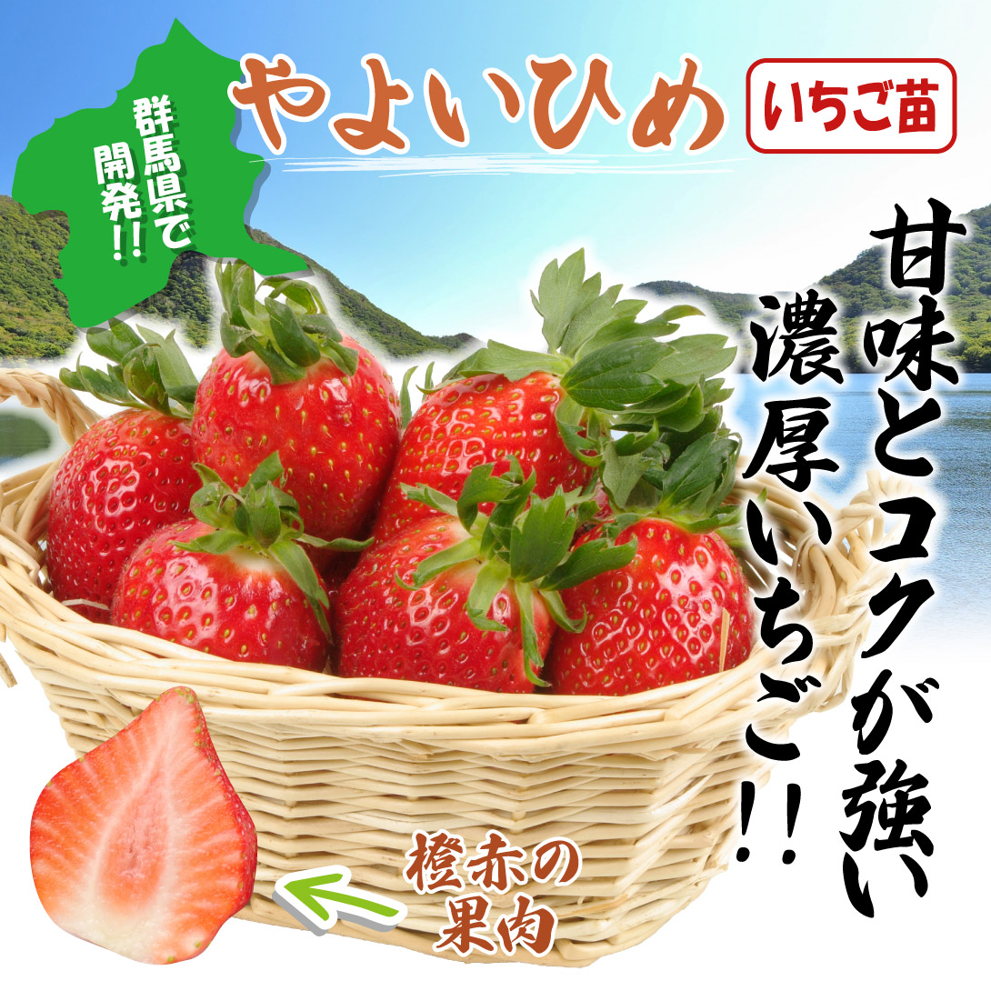 群馬県で開発されたブランド品種「やよいひめ」。味が濃いのが特長で、酸味が少なく甘味やコクが強いイチゴ!!平均果重20gの大粒。果肉色は橙赤、果芯の色は淡赤で断面の美しさが魅力的。果肉がしっかりしているので傷みにくく、日持ちがよいのが嬉しい。