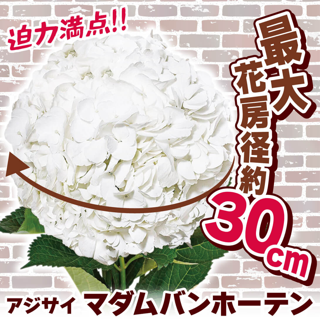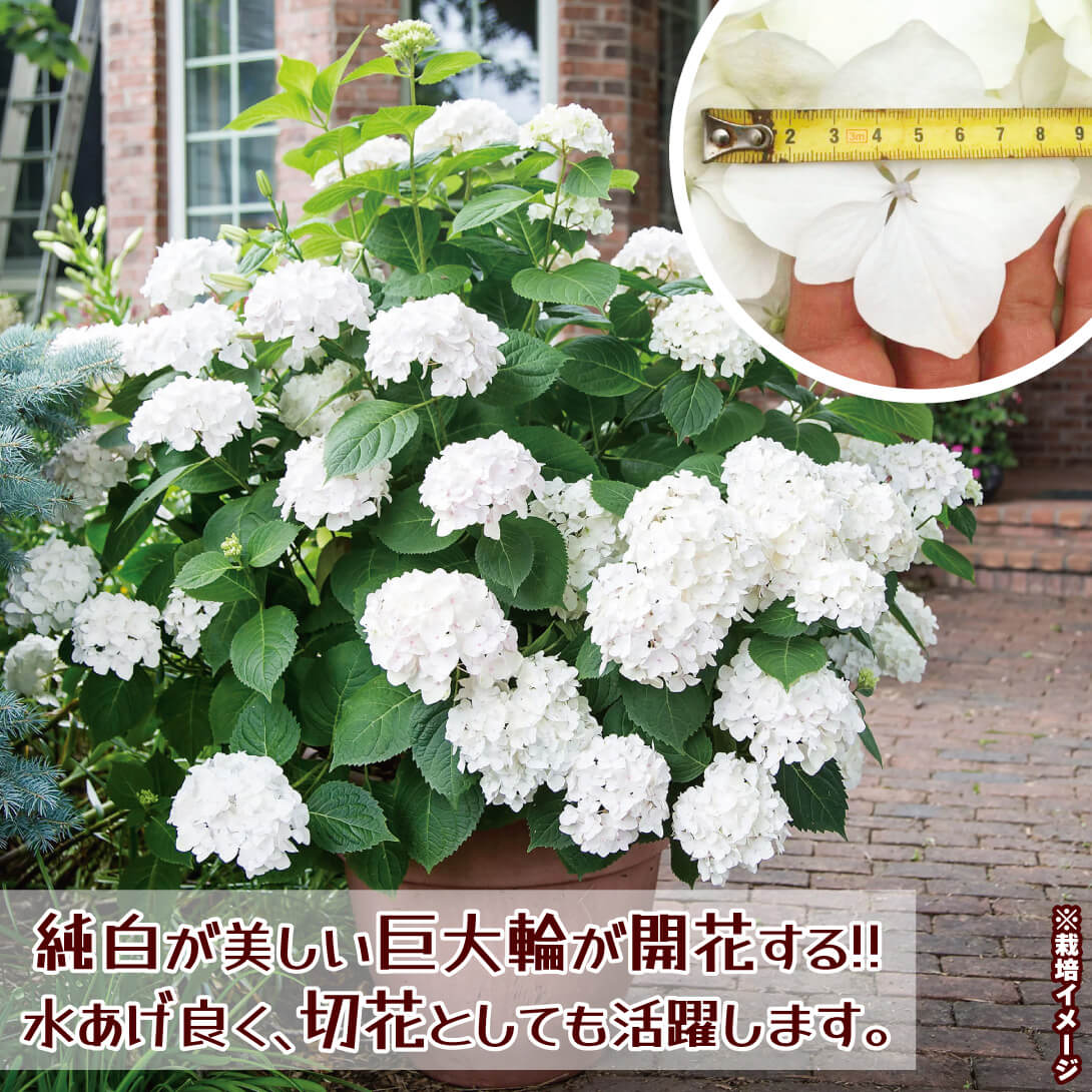 ●商品情報:最大花房径約30cmの超巨大輪で迫力満点!! 純白花が咲き誇ります。水あげ良く切花としても優れています。