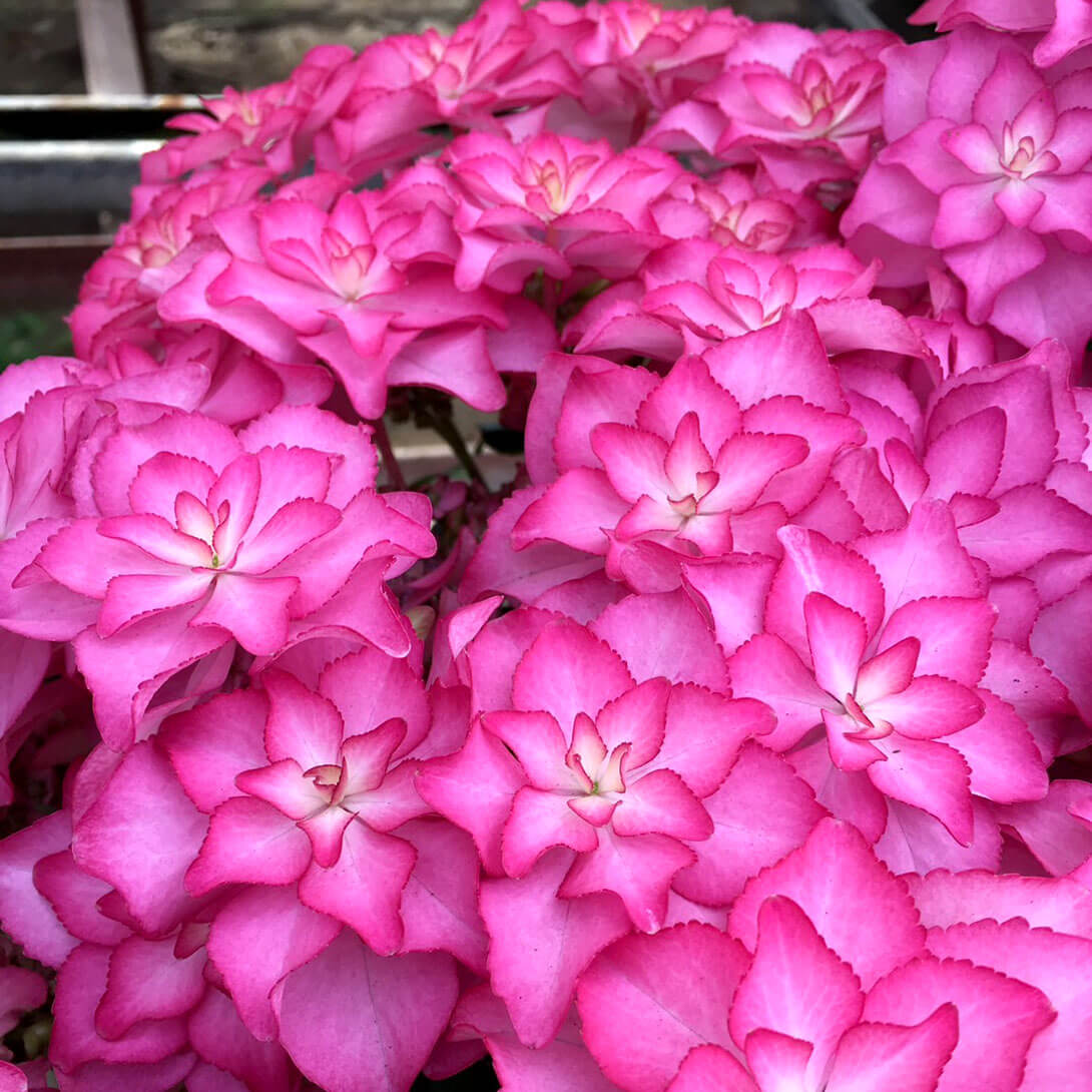 発色鮮やかな八重咲きアジサイで、とってもゴージャス!! ガク咲きから手まり咲きへの変化も楽しめます。