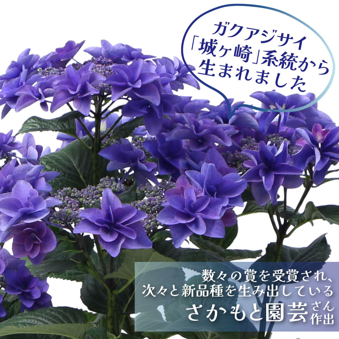 ●商品情報:ガクアジサイ「城ヶ崎」の育成系統同士を交配して誕生! 両性花の周りを彩る八重咲き装飾花が美しいシックなガク咲き。