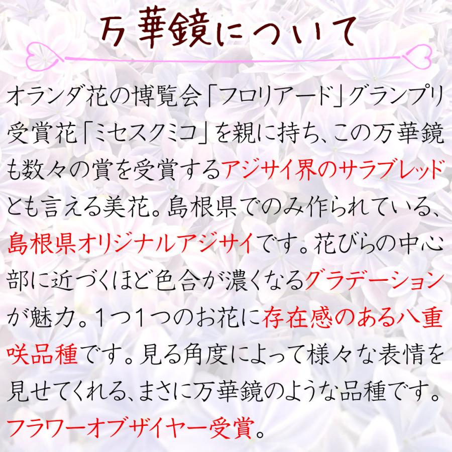 オランダ花の博覧会『フロリアード』にてグランプリを受賞した「ミセスクミコ」を親に持ち、この「万華鏡」自身もフラワーオブザイヤーを始め、数々の賞を受賞したアジサイ界のサラブレッドともいえる美花です。