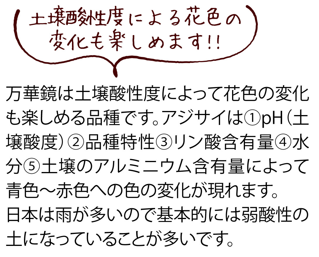 ※元々品種がもつ特性により、土壌酸度だけでは色が変化しないものもあります。「万華鏡」は土壌酸度で色が美しく変化するアジサイですので、花色の変化をお楽しみいただけます。