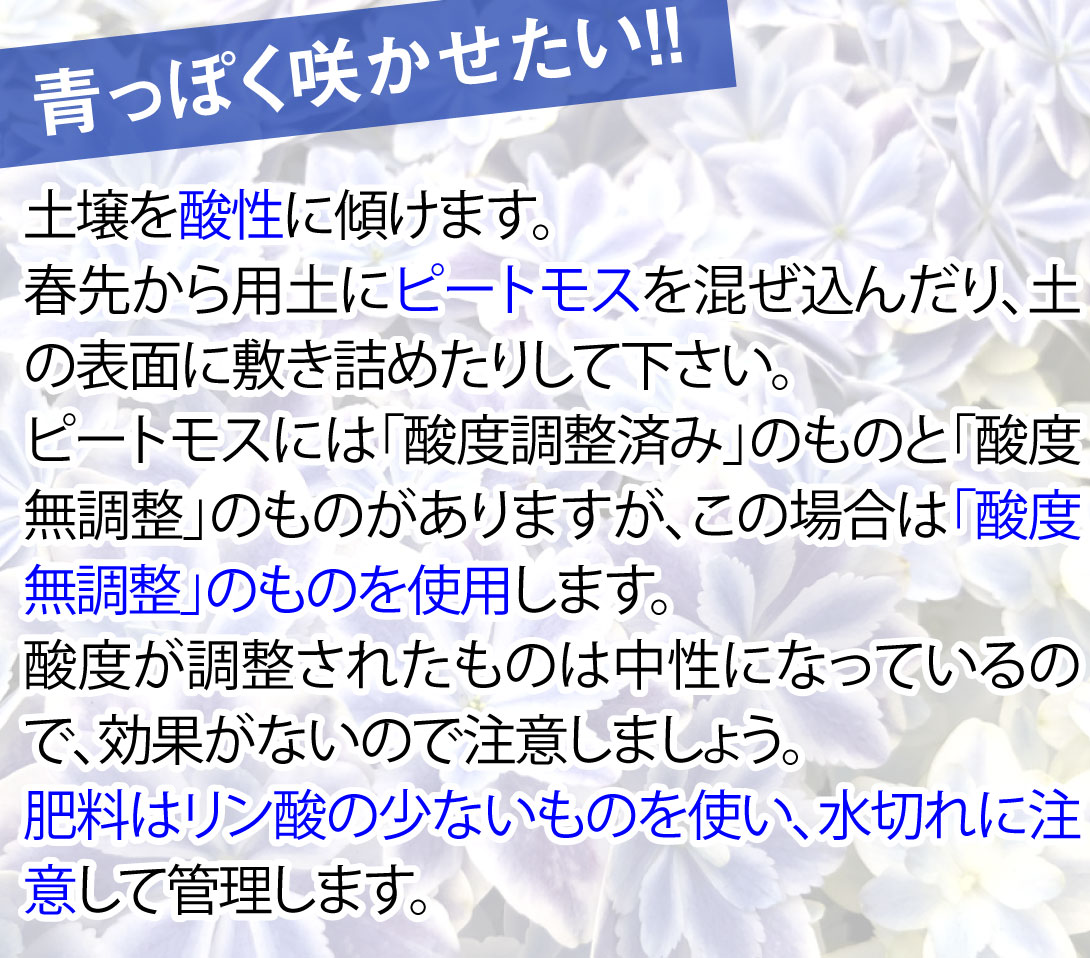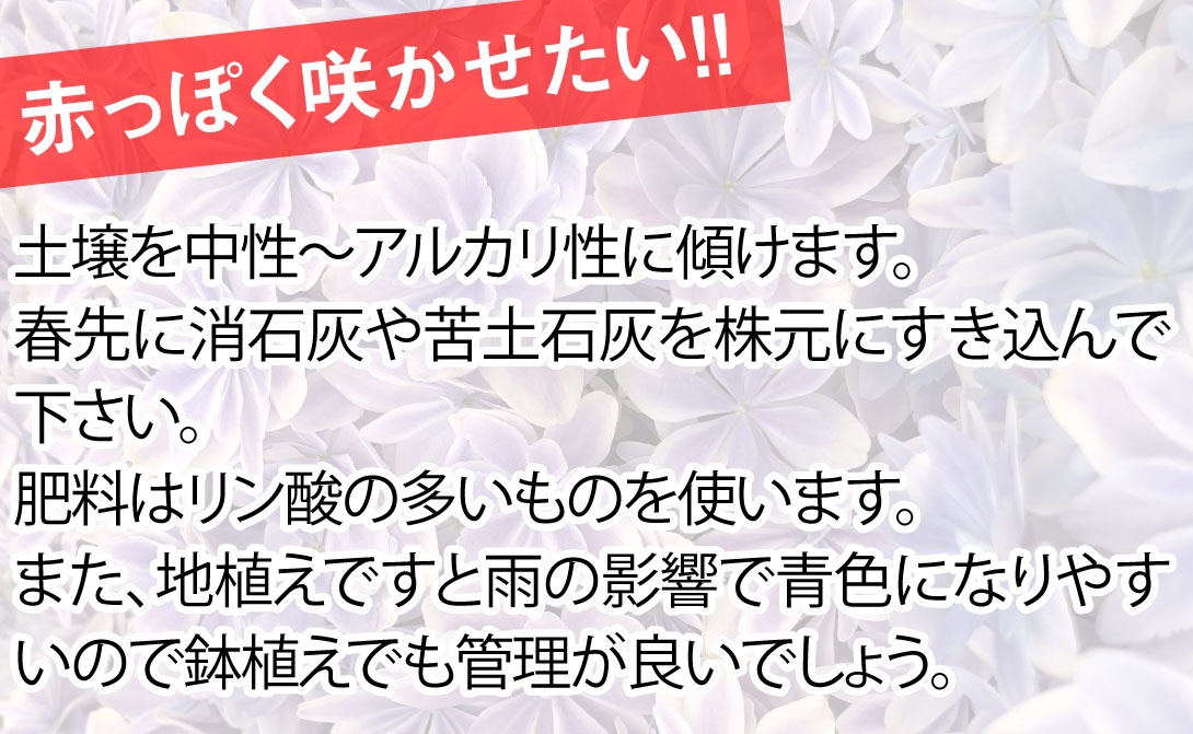 ※アジサイの花は土壌酸度により花色が変化し、酸性土壌なら青、アルカリ性土壌なら赤に変わるといわれていますが、