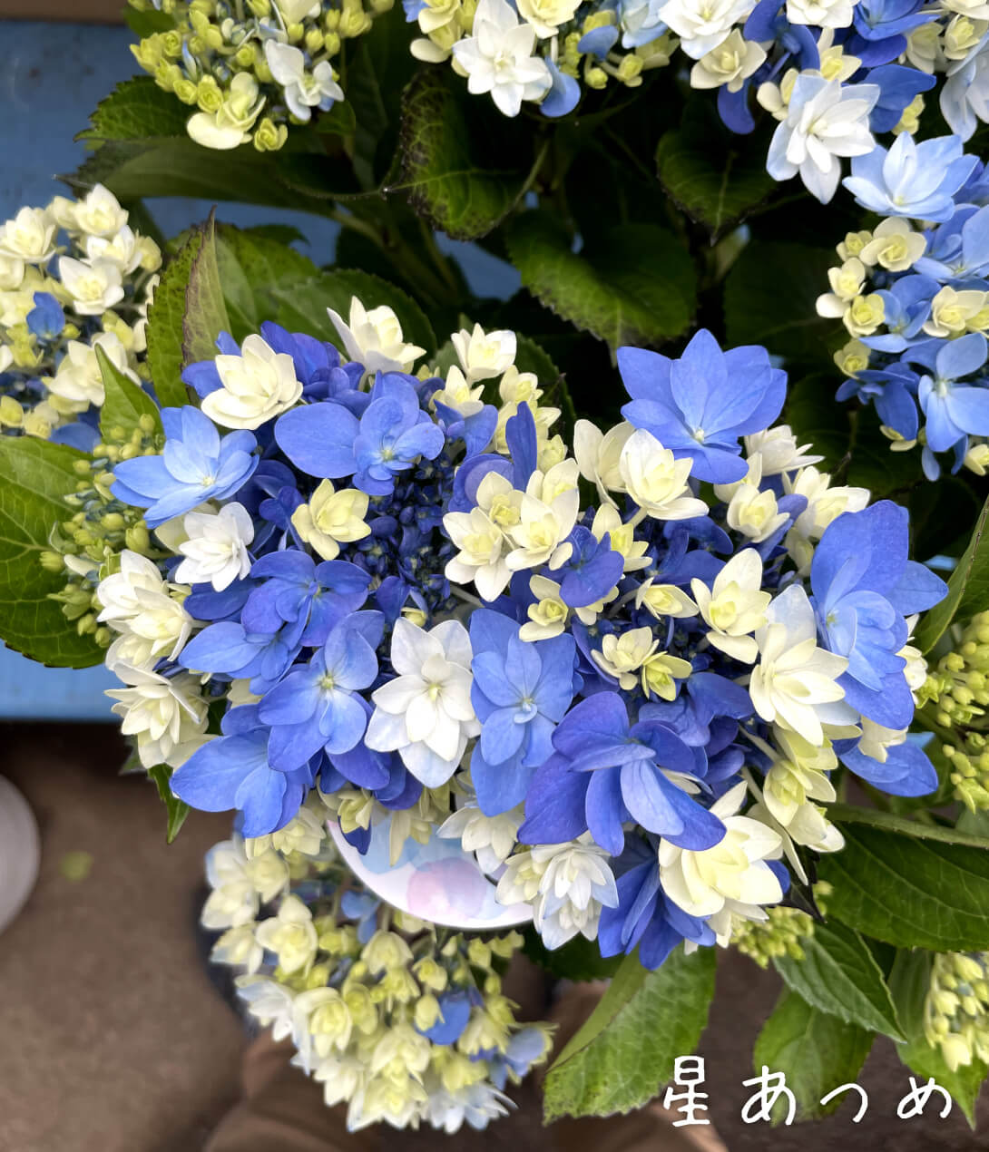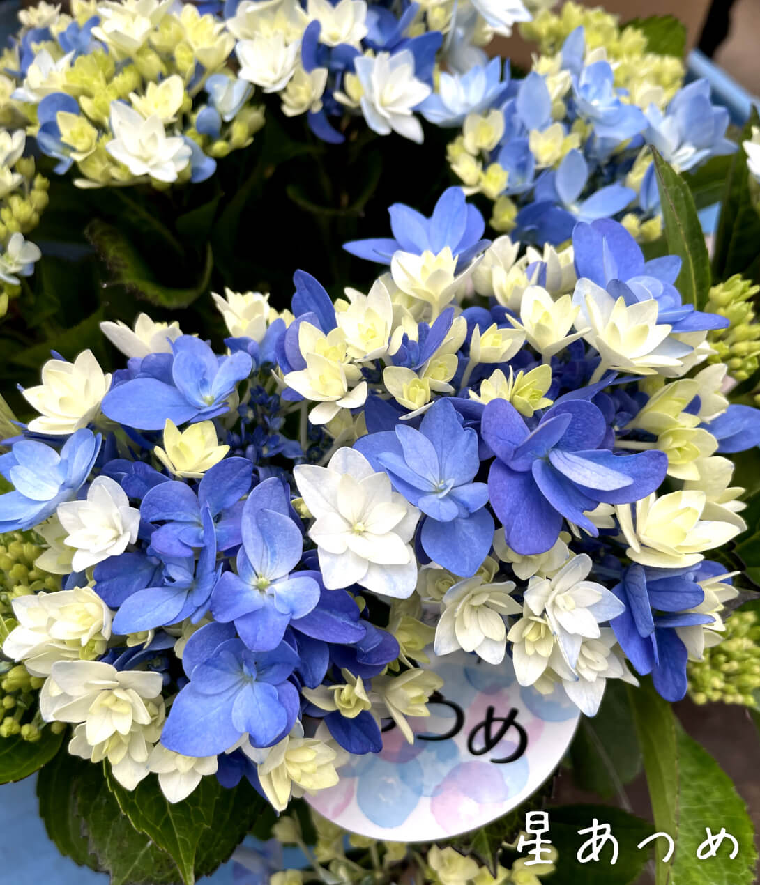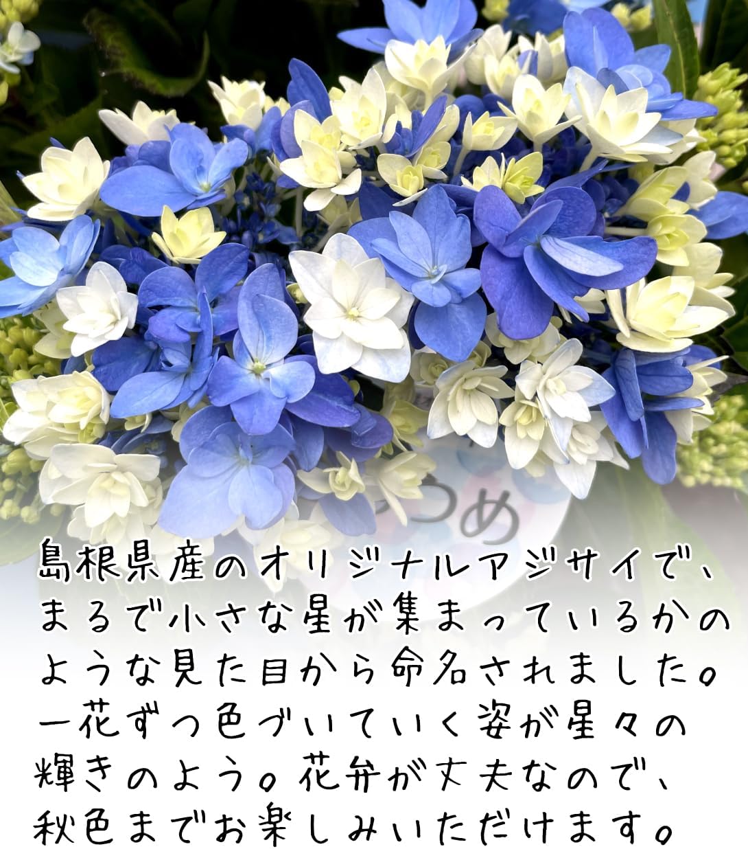 小ぶりの手毬咲きの八重咲きアジサイで、一つ一つの小花が色づくタイミングが異なる様子が、まるで小さな星が集まって輝きを放っているかのような美しさから命名されました。