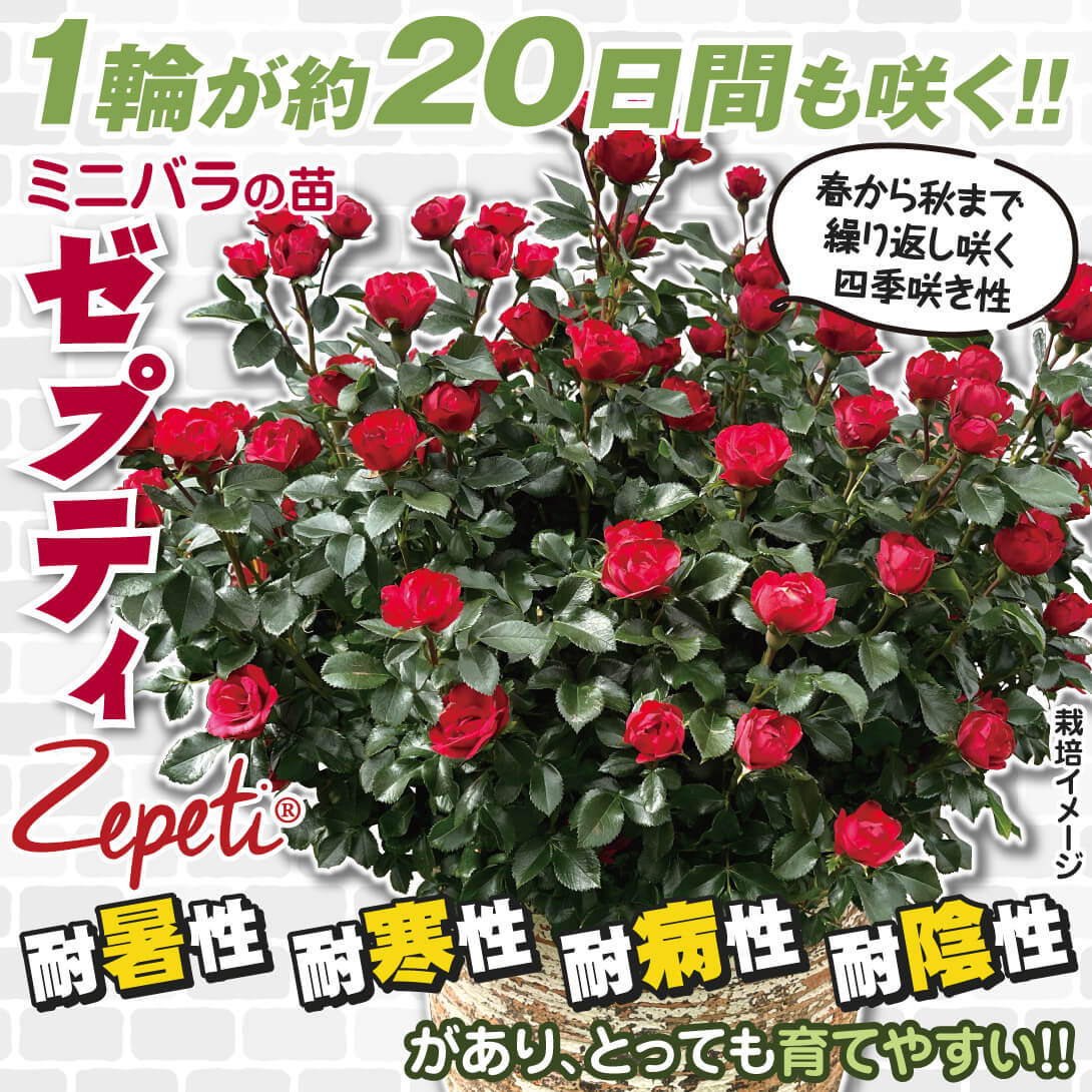 ●商品情報:ゼプティは耐寒性・耐暑性・耐病性・耐陰性に優れた、とっても育てやすいミニバラです! 春から晩秋まで繰り返して咲く花は花もちも良く、1輪の花が約20日間もちます。適宜ピンチすることで花数も増え、花弁が散りにくくコンパクトな樹形なので、日の当たる窓辺や玄関先など様々なシーンで楽しめます。