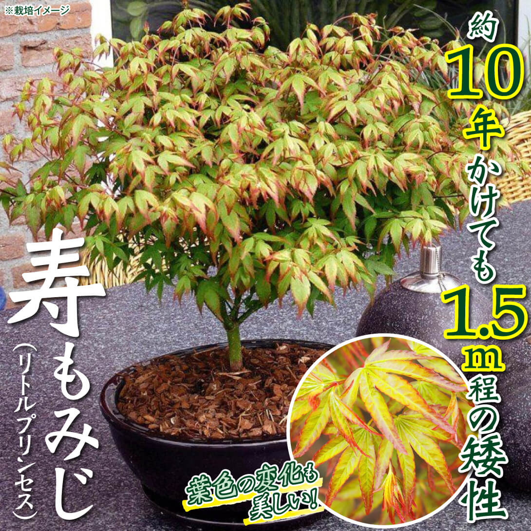 寿もみじ(リトルプリンセス)は、約10年かけても樹高1.5m程とゆっくり生長しコンパクトに育つもみじです。 大きくなりすぎない樹形は鉢植えにもぴったり! 葉色の変化も美しく、春には緑色葉が赤く縁取られ、夏には深緑色葉に、秋には鮮やかに紅葉する姿を楽しめます。