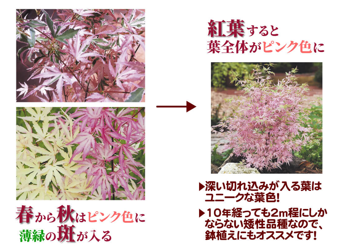 ●商品情報:10年かかっても2m程にしかならない矮性のモミジで、鉢植えにも最適! 深い切れ込みが入る葉は、春から秋はピンク色に薄緑の斑が入るユニークな葉色で、紅葉すると葉全体がピンクに染まります。